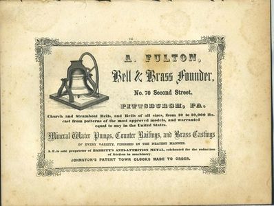 The A. Fulton Bell & Brass Foundry of Pittsburgh, PA. was formed as a partnership agreement between Andrew Fulton and Hugh Gallager in 1828 for casting bells, pumps and other bronze and brass goods. It not much is known about the early days of this foundry but it is documented that in 1845 the foundry burned down. Andrew was able to rebuild the foundry immediately, presumably with his own funds as the name of the company became A. Fulton & Company. The foundry quickly gained a reputation for casting some of the finest bells in America.