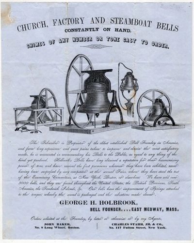 In 1812 Holbrook experienced some financial difficulty and left Brookfield, eventually relocating to East Medway, MA. In 1816 he established another bell foundry after getting a contract to cast a bell for a new meeting house that was planned. The bells cast by George during the time frame were embossed GEORGE HOLBROOK. He cast a number a bells over the next 4 years and in 1820 he retired.